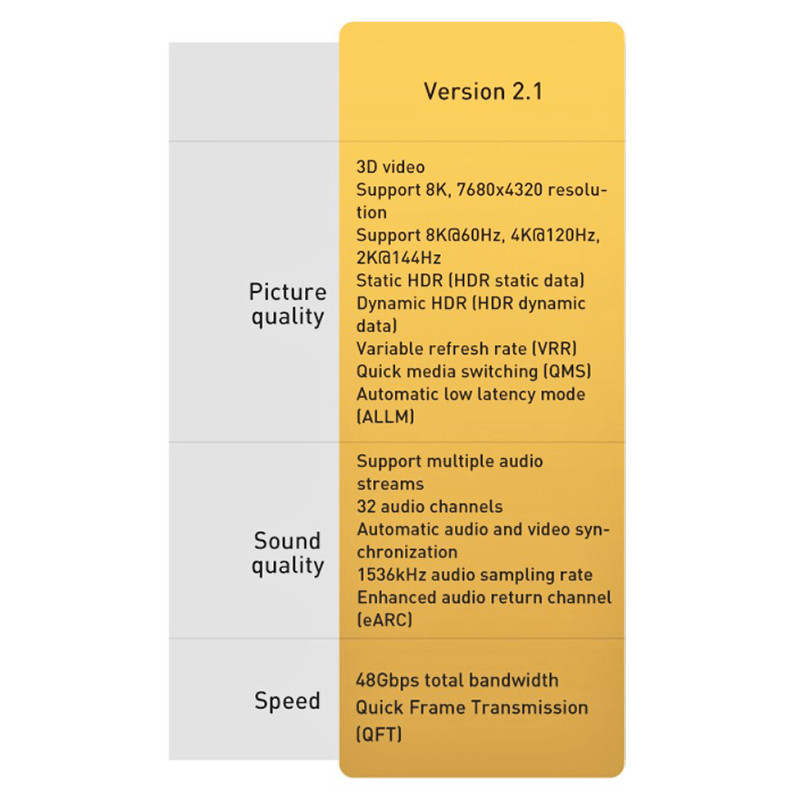 با این کابل شما 32 کانال صدا خواهید داشت و دیگر نگران هماهنگی صدا و تصویر نخواهید بود. در انتها باید به این نکته بسیار مهم نیز اشاره کنیم که این کابل نسخه HDMI 2.1 است که با پهنای باند 48Gbps کار میکند.