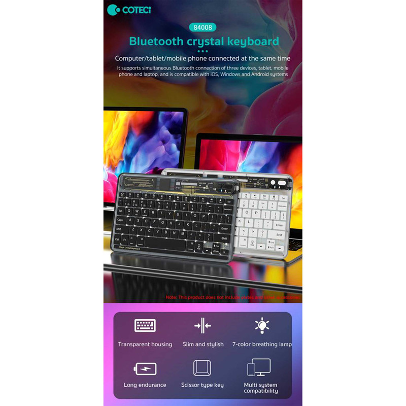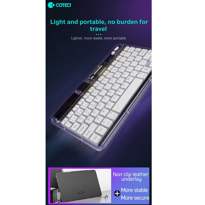 کار کردن با کامپیوتر، گوشی همراه و تبلت کاری اجتنابناپذیر است و ممکن است در طول روز با همه آن سروکار داشته باشیم؛ پس بهتر است برای استفاده راحتتر و همین طور سریعتر انجام شدن کارها از یک کیبورد استفاده شود.با پیشرفت تکنولوژی و اینترنتی شدن اکثر مشاغل استفاده از کامپیوتر نسبت به گذشته بیشتر شده است. داشتن یک کیبورد با کیفیت میتواند روند کاری شما را افزیش دهد. به علاوه کار کردن طولانی مدت با آن موجب خستگی شما نمیگردد.کیبورد کوتتسی مدل 84008 با طراحی زیبا، بسیار خوش دست میباشد و کار با آن راحت و لذت بخش است.صفحه کلید Coteetci Bluetooth Crystal keyboard 84008 رنگ های مختلفی دارد؛ وزن آن فقط 247 گرم است و طراحی جذاب با کلیدهایی در ارتفاع کم دارد که باعث شده صدای اضافه و اذیتکنندهای هنگام تایپ کردن نداشته باشد. بدنه آن را پلاستیک بادوام ABS تشکیل داده و در برابر آسیب بسیار مقاوم است.همچنین کلیدها ساختار X پای قیچی دارند و نیرو به طور یکنواخت وارد میشود و این ساختار تلاش و خستگی کمتر را به همراه دارد.انتهای آن با چرم ضد لغزش پوشانده شده تا در جای خود ثابت باقی بماند. همچنین در طراحی آن چراغ 7 رنگ هم وجود دارد که جذابیت آن را چند برابر کرده است.کیبورد بیسیم کوتتسی مدل 84008 از قابلیت اتصال سهحالته برخوردار بوده و بهشما اجازه میدهد تا آن را بهطور همزمان به 3 دستگاه متصل کنید؛ با سیستمعاملهای اندروید، iOS و اندروید سازگار است.بهعلاوه این محصول دارای یک باتری لیتیومی 500 میلیآمپرساعتیست که از طریق درگاه Type-C شارژ میشود. زمان مورد نیاز برای شارژ کامل 2.5 ساعت بوده و تا 60 روز البته بدون نور پس زمینه پاسخگوی شارژ باتری خواهد بود.درگاه ارتباطی این کیبورد بلوتوث و کابل تایپ سی میباشد