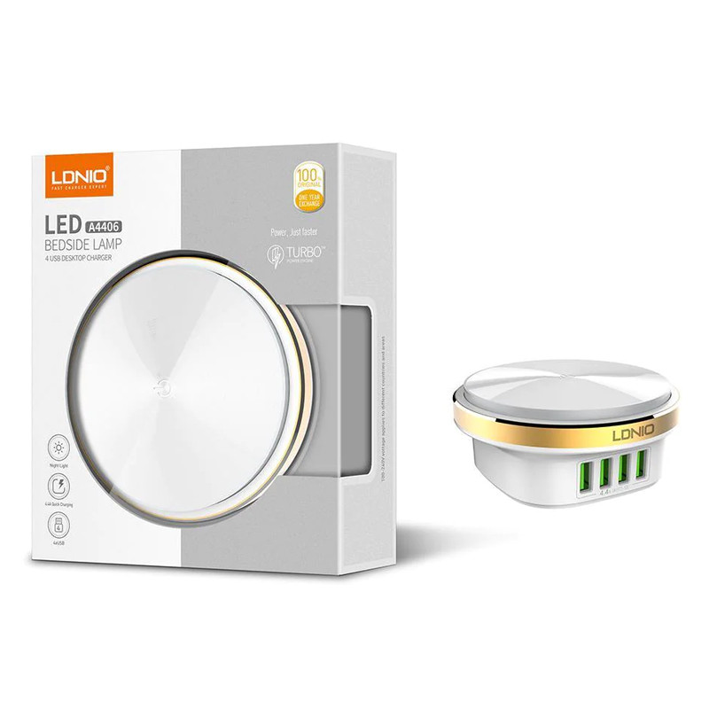 هاب الدینیو مدل Bedside Lamp همینطور دارای 4 پورت USB جهت شارژردهی می باشد. این پورت های USB دارای تکنولوژی Auto-ID هستند و شدت جریان خروجی را بسته به دستگاه متصل به آن به خوبی تنظیم و کنترل می کنند. این ویژگی سبب افزایش عمر باتری دستگاه متصل نیز می شود. توان خروجی این سه پورت 4.4 آمپر و 5 ولت بوده و لامپ های LED نیز دارای حداکثر توان 2.4 وات می باشند. البته تعداد لامپ های LED به کار رفته 12 عدد است. درجه حرارت لامپ این چراغ خواب 6500K می باشد.