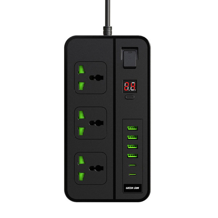 دارای چهار پورت USB-A | دارای دو پورت Type-C | نمایشگر دیجیتال | طول کابل متصل 2 متر | پریزهای برق از نوع Universal | سه شاخه متصل به پریز از نوع UK