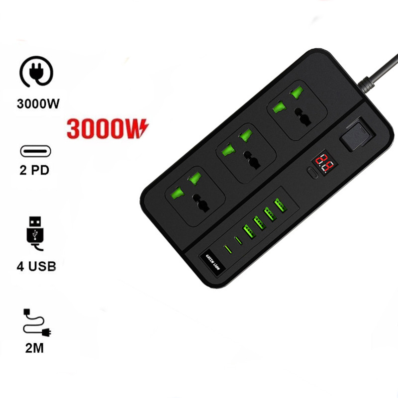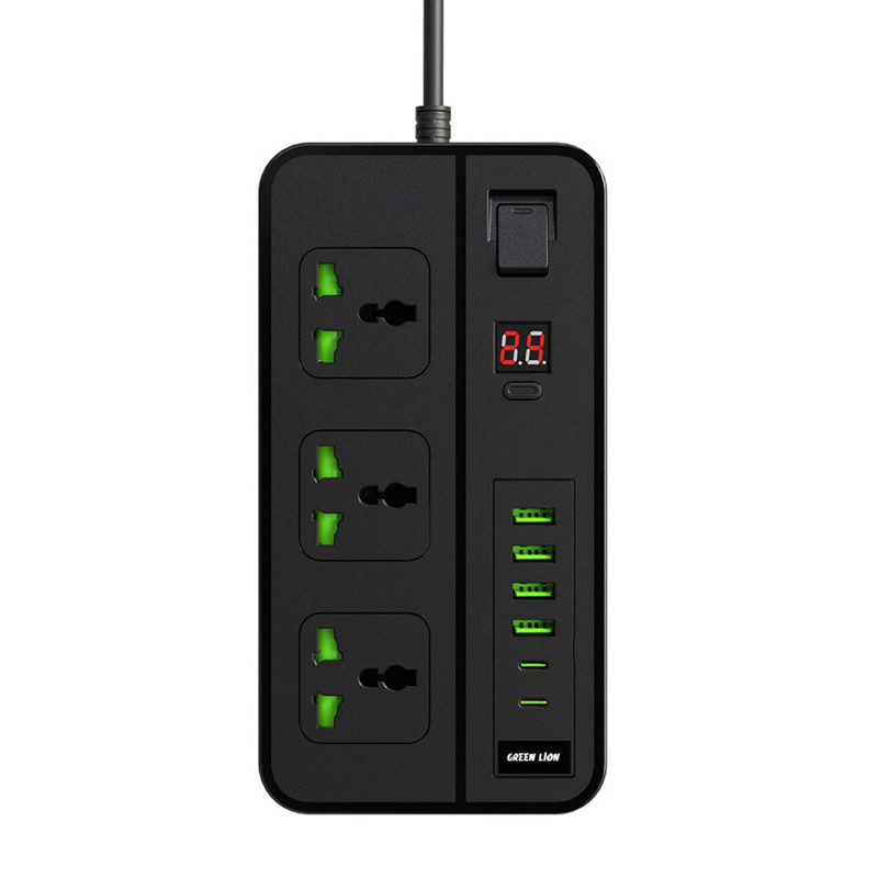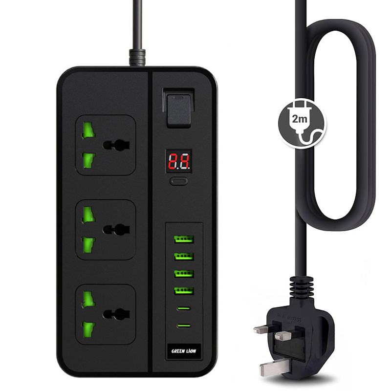دارای چهار پورت USB-A | دارای دو پورت Type-C | نمایشگر دیجیتال | طول کابل متصل 2 متر | پریزهای برق از نوع Universal | سه شاخه متصل به پریز از نوع UK