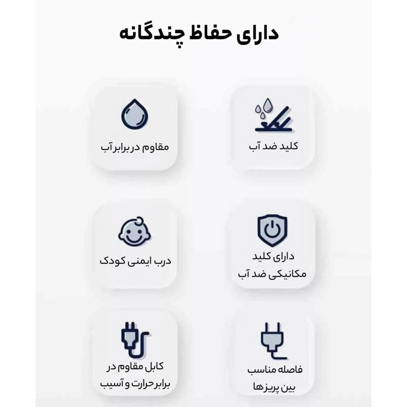 دارای 2 خروجی برق از نوع Universal | حداکثر توان خروجی برق 2500 وات | حداکثر توان خروجی شارژ 20 وات | 1 خروجی Type C و 3 خروجی USB | قابلیت شارژ سریع PD و QC 3.0 | ضد آب و مقاوم در برابر گرمای بالا